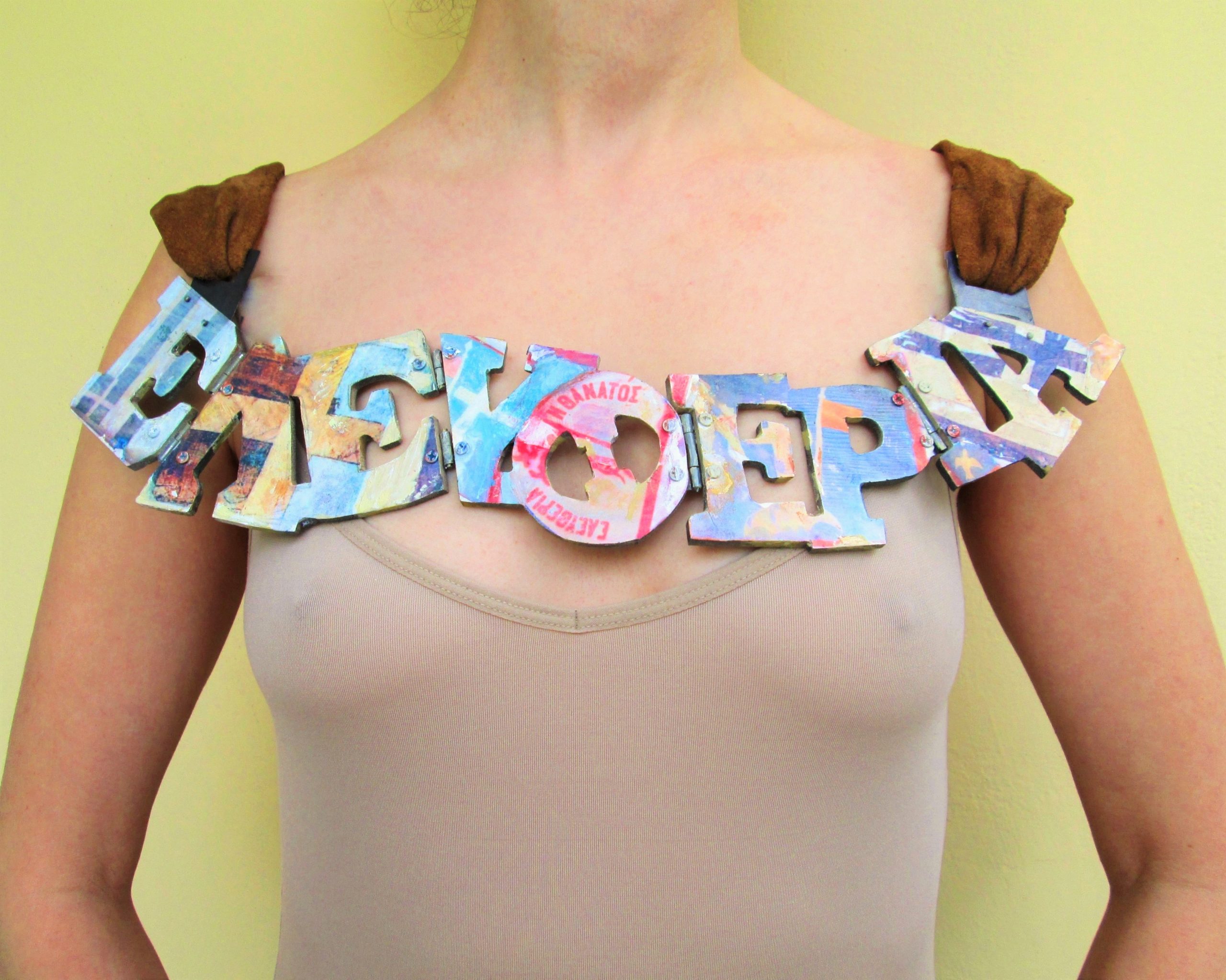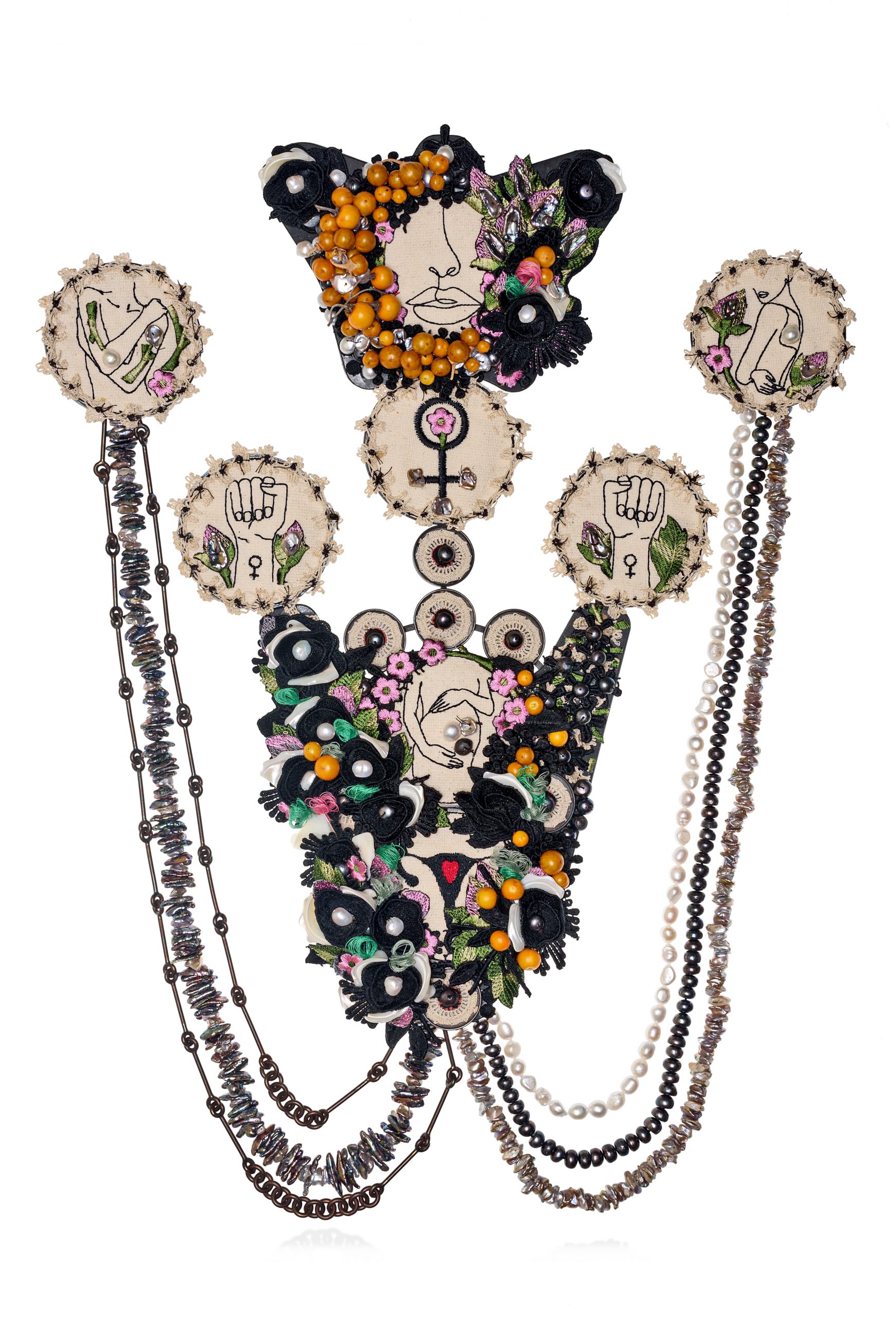 Το σύνθημα «Ελευθερία ή Θάνατος» ενσαρκώνεται υπερήφανα στο περιδέραιο της Γιώτας Βόγκλη. Κοσμήματα σώματος που έχουν εμπνευστεί από το τσαπράζι, την κατοστάρα ή τα κιουστέκια, συνδέουν τον υλικό πολιτισμό με την σημειολογία της επανάστασης. Η Σοφία Ζαράρη μέσα από το έργο της, προκαλεί μια σημειολογική συσσώρευση. Με σημείο εκκίνησης το ελληνικό παραδοσιακό κόσμημα, εμπνέεται από τον δυναμισμό της γυναικείας παρουσίας και την Λασκαρίνα Μπουμπουλίνα. Κρατώντας την κατασκευαστική πολυπλοκότητα που διέπει το κιουστέκι, η καλλιτέχνις θίγει την διαχρονική καταδυνάστευση της γυναίκας, την θέση και τους αγώνες της στο σήμερα, σε κάθε γωνιά του κόσμου. Ένα τέτοιο κόσμημα ολοκληρώνεται μονάχα όταν φορεθεί. Έτσι, τρεις γυναίκες το φορούν και ιστορούν τον δικό τους, σύγχρονο αγώνα, διατηρώντας ορατό ένα σύγχρονο κοινωνικό ζήτημα, μέσα από μια διαπολιτισμική αφήγηση. Αντίστοιχα, η εξέγερση αίματος της Nicole Polentas ερευνά την πολυπλοκότητα και τις ιδεολογίες των κοινωνικών και πολιτικών επαναστάσεων, διαχρονικά, μέσα από την αφαιρετική και την ανατροπή των κειμένων και των συμβόλων, προσθέτοντας στην πολυδιάστατη εικόνα της επανάστασης την πνοή της σύγχρονης εφαρμοσμένης δημιουργίας.